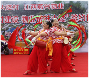 簽約儀式前,燕興物業員工與火燃村的村民們同臺進行了文藝表演,開場舞《歡天喜地豐收年》、舞蹈《沙石表嫂扭起來》、民樂演奏《喜洋洋》、軍體操《燕興物業形象展示》、舞蹈《十送紅軍》等節目輪番上臺,用激情的舞蹈、特色的鄉村小戲和燕興人的精神風貌展示等節目,開啟燕興物業幫扶火燃村建設美麗鄉村行動。