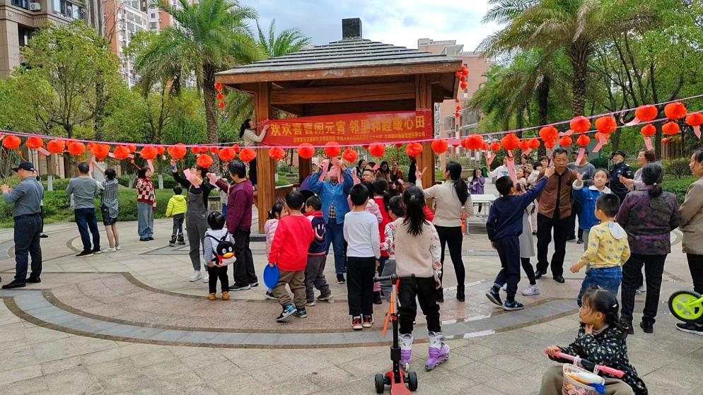 贛州嘉福國際小區聯合泥灣里社區開展“歡歡喜喜鬧元宵  鄰里和睦暖心田”猜燈謎游園活動,一排排懸掛的彩色燈謎條渲染出喜慶的節日氛圍,妙趣橫生的燈謎吸引眾多業主前來參與,有趣的小游戲吸引孩子們駐足游玩。只見業主們帶著孩子,穿梭在懸掛的燈籠中,看謎面、猜謎語、玩游戲,現場一片歡聲笑語,共同度過其樂融融的歡樂時光。