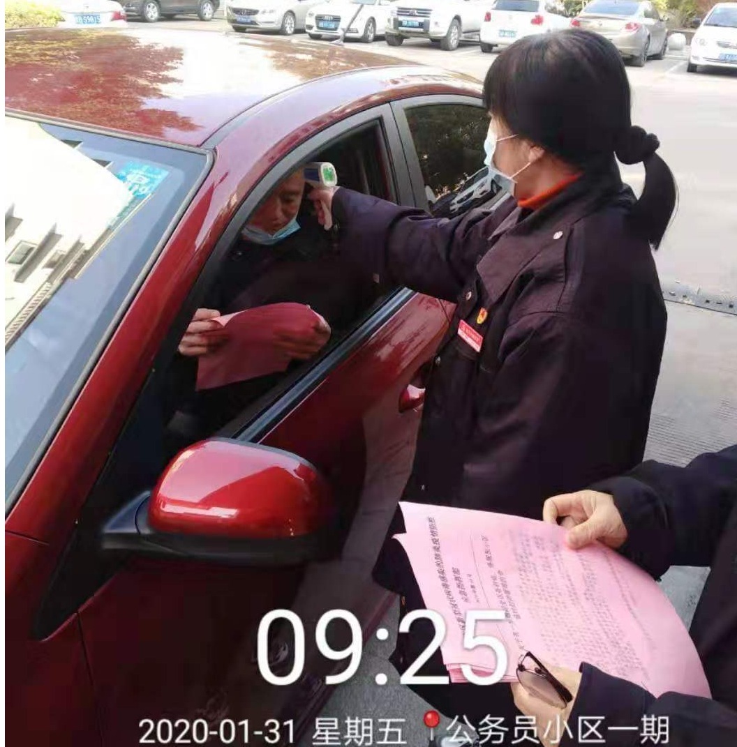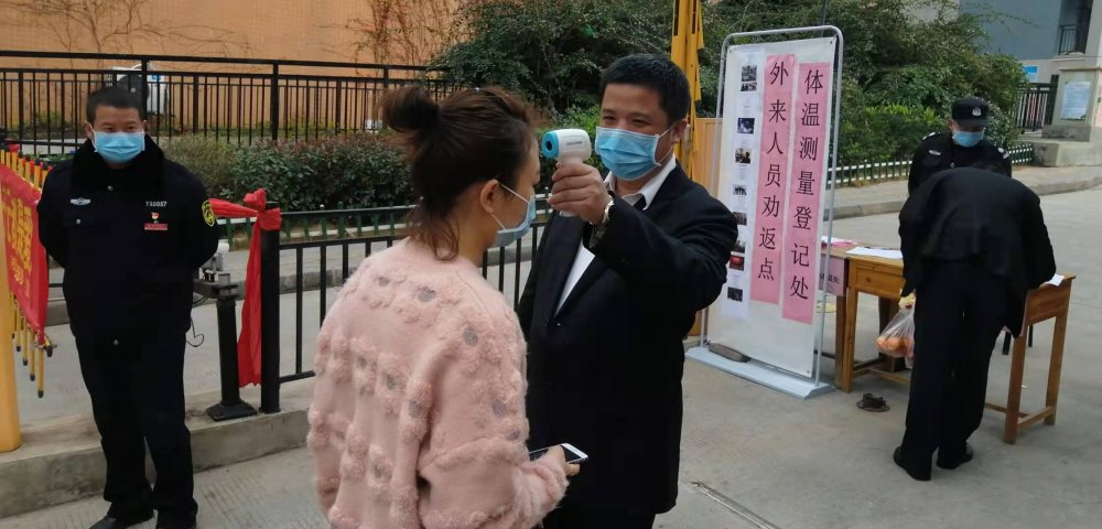 第一黨支部預(yù)備黨員,副董事長陽敏在陽光金色春城小區(qū)對進(jìn)出人員進(jìn)行體溫測量