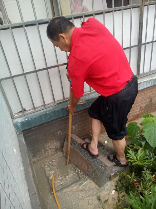 文庭華園小區(qū)秩序維護(hù)員在疏通排污井