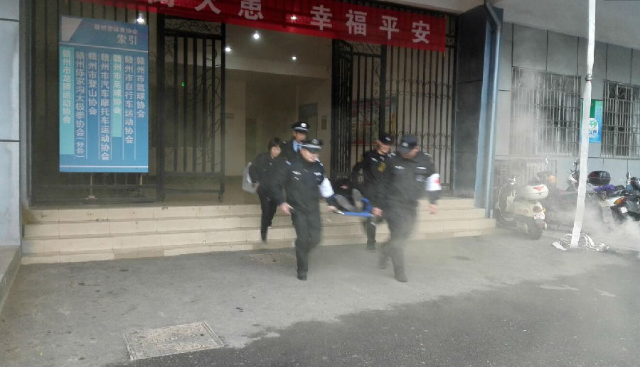 一培訓(xùn)完,參加演練的全體人員整裝列隊,在演練總指揮的一聲令下,演練正式開始。這次演練的主要內(nèi)容為通訊報警、警戒保障、疏散救護(hù)和行動滅火。現(xiàn)場模擬體育中心某處冒出滾滾濃煙,物業(yè)公司接到火警報告后,立即啟動火災(zāi)應(yīng)急處置預(yù)案,通訊聯(lián)絡(luò)組、疏散警戒組、滅火行動組、后勤救護(hù)組按照預(yù)案立刻展開行動。通訊聯(lián)絡(luò)組立即撥打119、120救援電話;疏散警戒組立刻對各路口進(jìn)行警戒封鎖,組織被困人員沿著設(shè)定的逃生路線有序撤出大樓;滅火行動組第一時間帶著消防水帶、滅火器等消防器材趕到火災(zāi)地點,將大火有效控制直至撲滅;后勤救護(hù)組對在火災(zāi)現(xiàn)場受傷的人員進(jìn)行救護(hù),傷情較重的用擔(dān)架抬出至安全地帶進(jìn)行救治……各個環(huán)節(jié)臨危不亂,環(huán)環(huán)相扣,操作嚴(yán)謹(jǐn)。