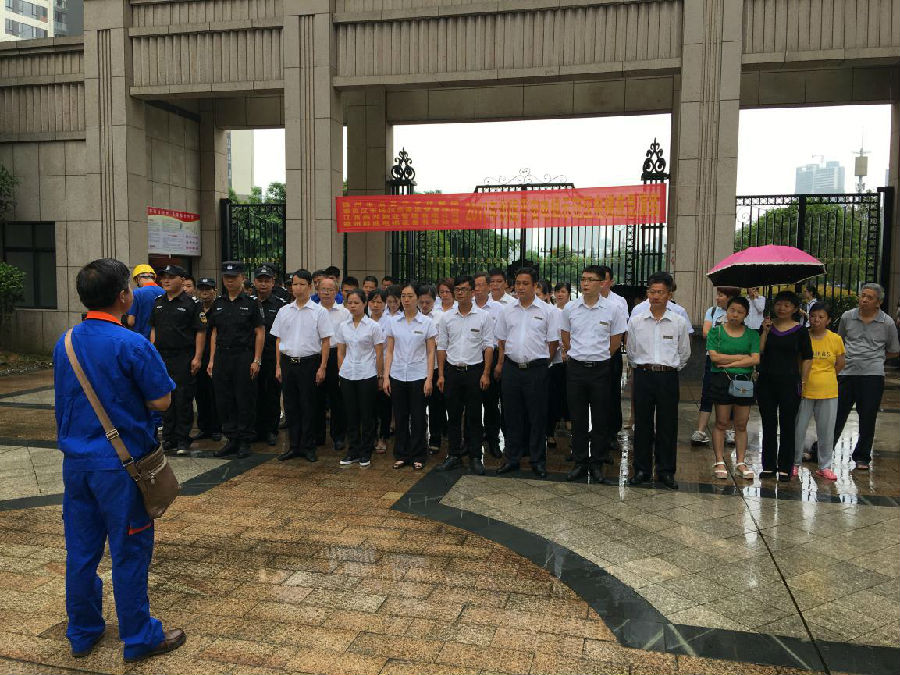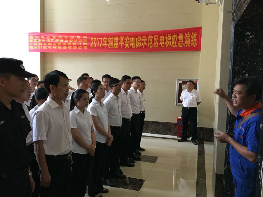 2017年6月是全國第十六個“安全生產(chǎn)月”。2017年6月15日,為貫徹“全面落實(shí)企業(yè)安全生產(chǎn)主體責(zé)任”為主題的“安全生產(chǎn)月”活動宗旨,創(chuàng)建章貢區(qū)“平安電梯”安全管理示范區(qū),加強(qiáng)對電梯運(yùn)行的安全管理,提升應(yīng)對電梯突發(fā)事故的處置救援能力,最大限度保障電梯乘客的人身安全與設(shè)備安全,根據(jù)國家《特種設(shè)備安全監(jiān)察條例》及其他相關(guān)規(guī)定的要求,贛州市質(zhì)量技術(shù)監(jiān)督局、章貢區(qū)市場與質(zhì)量監(jiān)督管理局、江西燕興物業(yè)管理有限公司、贛州群威電梯設(shè)備有限公司聯(lián)合在章貢區(qū)水南新區(qū)公園壹號小區(qū)舉辦“2017年創(chuàng)建平安電梯安全管理示范區(qū)電梯應(yīng)急救援演練”。贛州市質(zhì)量技術(shù)監(jiān)督局、章貢區(qū)市場和質(zhì)量監(jiān)督管理局、贛州群威電梯設(shè)備有限公司相關(guān)領(lǐng)導(dǎo),我公司運(yùn)營部、工程部、小區(qū)服務(wù)中心主任、水電工、保安隊(duì)長、電梯安全管理人員,及公園壹號小區(qū)業(yè)主代表共計(jì)80余人參加了此次演練。