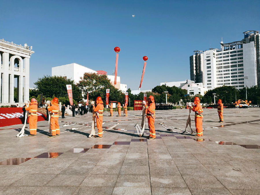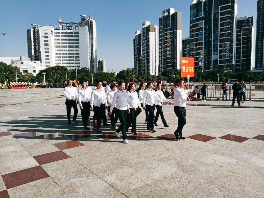 接著,在公司黨委書記、董事長劉燕的一聲令下,分列式演練展示和著《運動員進行曲》正式舉行。旗手陣隊、引路陣隊和黨員方隊、特勤方隊、應急方隊、管理方隊、管家方隊、義務消防方隊、保障方隊、環境管理方隊的隊員們,邁著矯健的步伐,精神抖擻地一一走過檢閱臺。他們步伐整齊劃一,氣勢威武雄壯,口號嘹亮,充分展現了燕興人蓬勃向上的精神面貌和昂揚奮發的工作斗志。