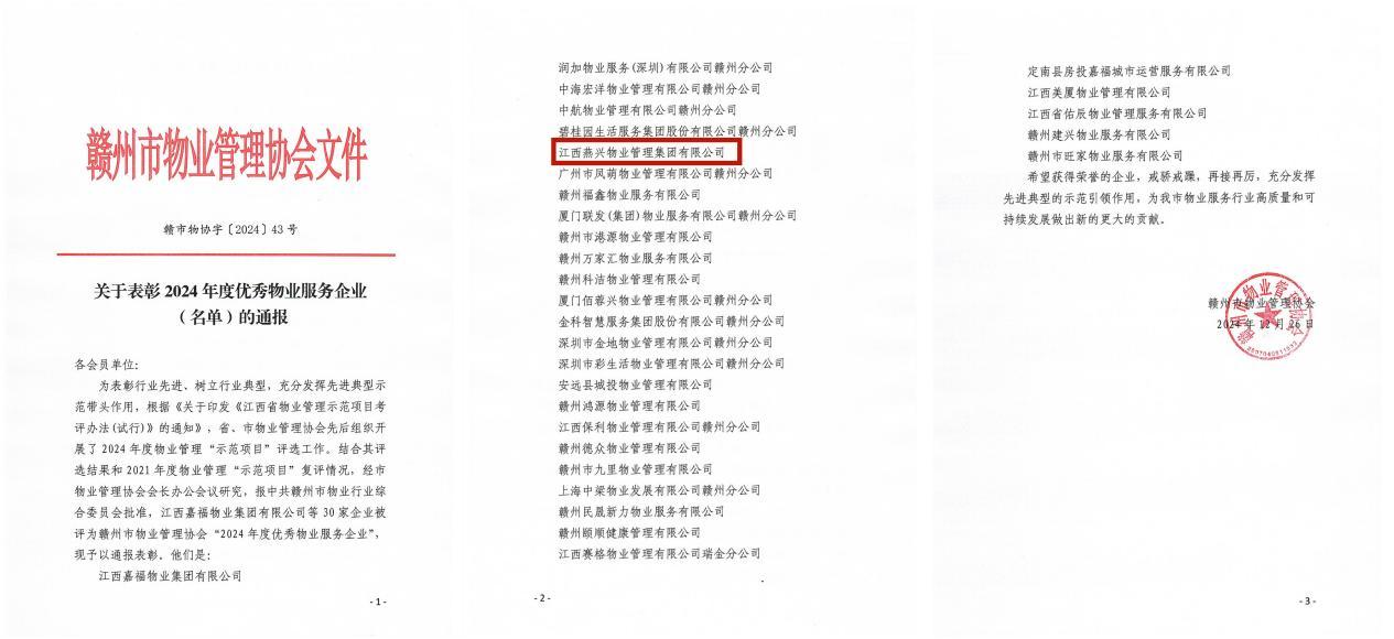 2025年元月7日,贛州市物業管理協會第五屆三次會員大會在贛州市格蘭云天國際酒店勝利召開,會上對2024年度優秀物業企業及個人進行了通報表彰。燕興物業喜獲贛州市“2024年度優秀物業企業”“2024年度誠信自律企業”“2024年度支持文明城市創建先進企業”榮譽稱號;龍南嘉和半島小區復評通過“贛州市優秀示范小區”,項目經理周群蓉喜獲“2024年度優秀物業項目經理”榮譽稱號,公園壹號小區物管員李小梅獲得“最美物業人”榮譽稱號。