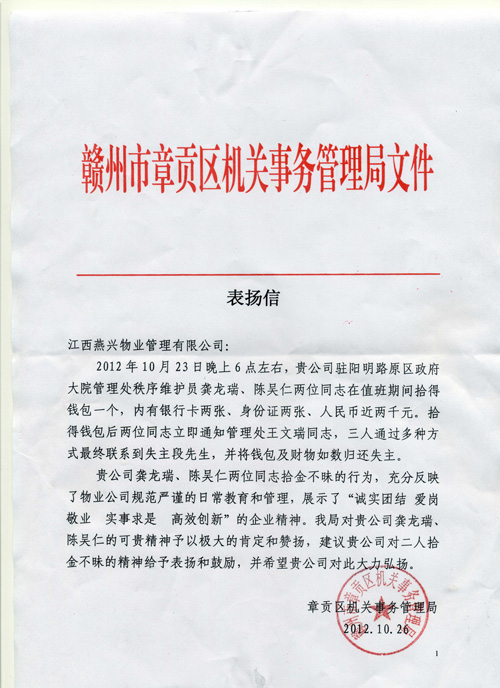 章貢區機關事務局給燕興物業送來一封表揚信 10月26日上午,煙臺葡萄酒駐贛州營銷部段方勇先生給原區政府大院物業服務中心送來一面錦旗,錦旗上書寫了八個大字... 2012-10-30