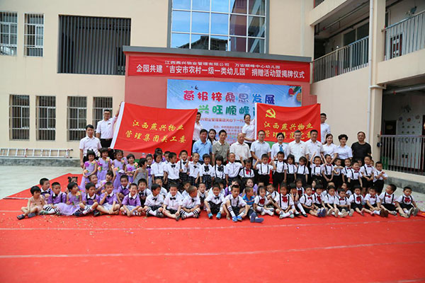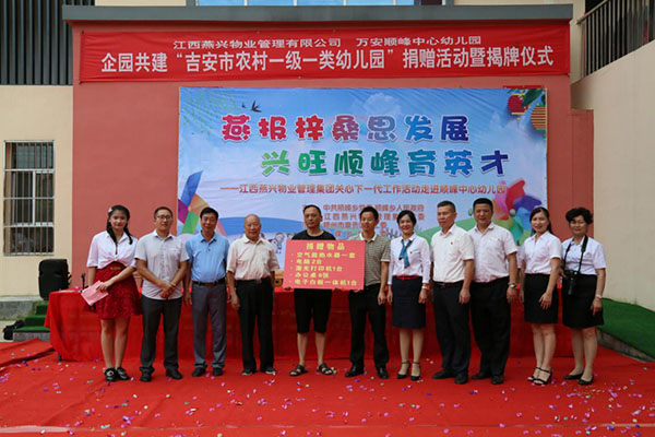 捐贈活動中,進(jìn)行了順峰鄉(xiāng)企園共建吉安市農(nóng)村一級一類幼兒園的揭牌。