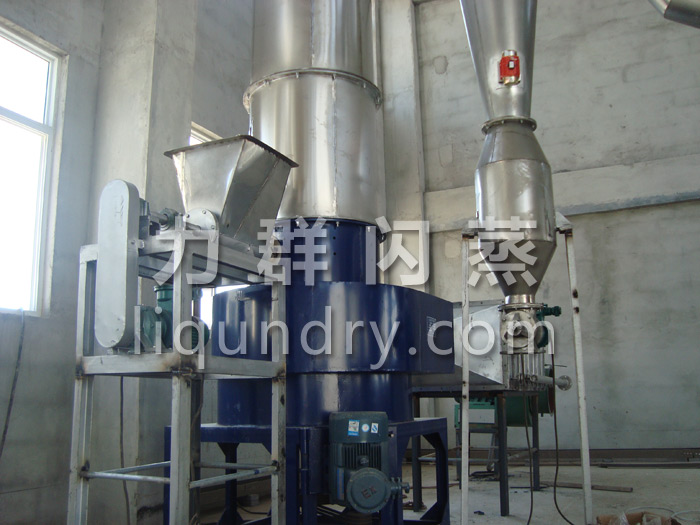 由于該產品的顆粒度要求在20-80目左右所以閃蒸干燥機的粉碎部分要做相應的調整,不能采用傳統的結構而且傳動電機的功率和轉速需采用變頻或調速儀控制。整套設備的進風溫度控制在150-160℃,出風溫度控制在70℃左右。物料有一定的粘性加料部分需采用雙螺旋加料機,整套設備在調試過程中一次性試車成功,一切技術要求全部達到設備運行穩定。
